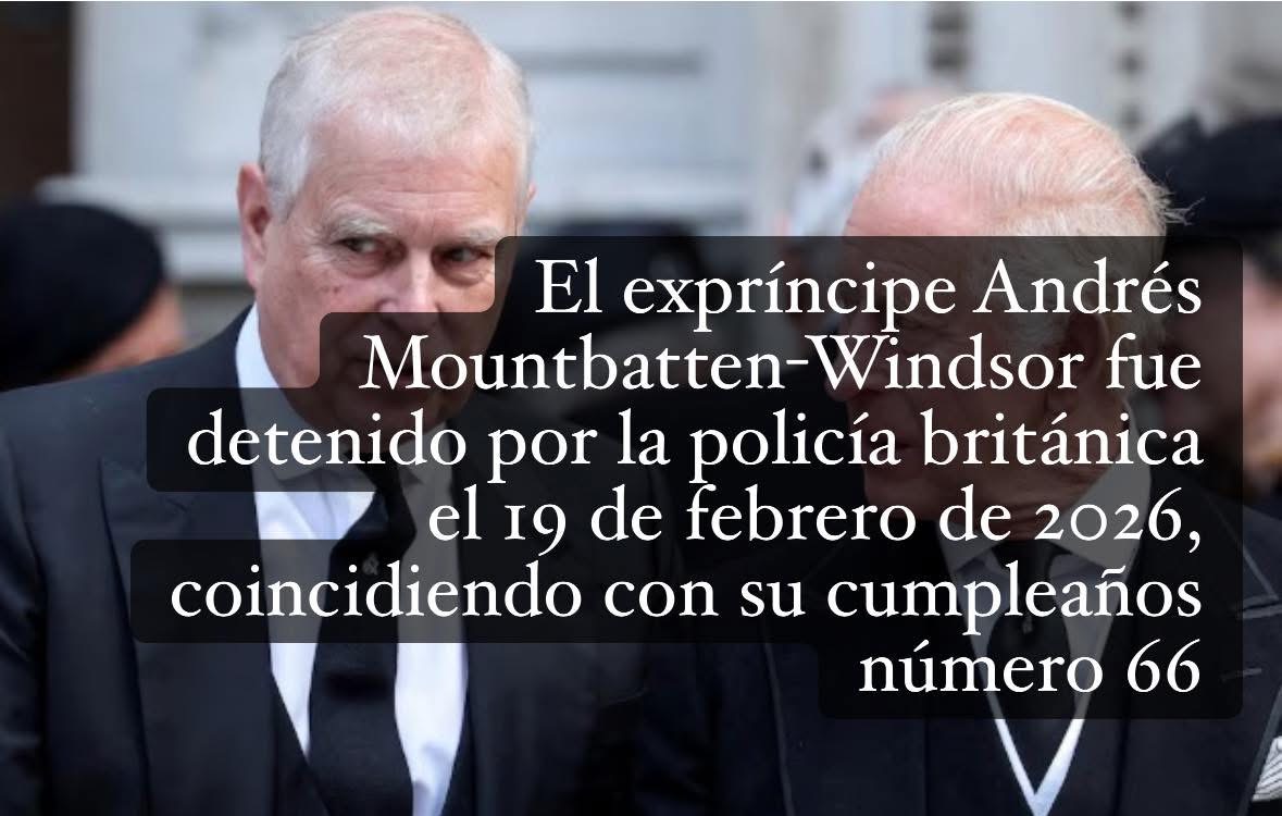 El expríncipe Andrés Mountbatten-Windsor fue detenido por la policía británica el 19 de febrero de 2026, coincidiendo con su cumpleaños número 66. Se le investiga bajo sospecha de mala conducta ...