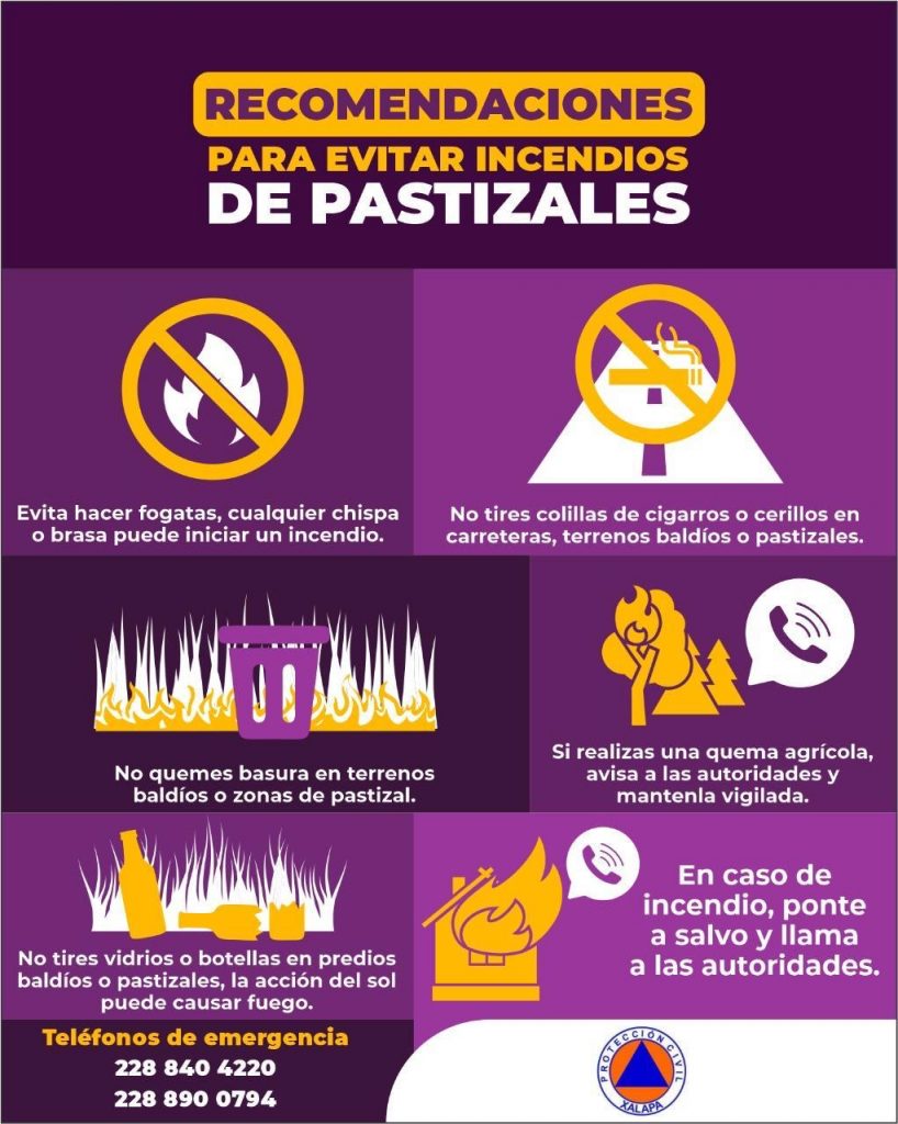 El director de Protección Civil, Enrique Fonseca, detalló que las congregaciones de Xalapa son susceptibles a presentar incendios en predios rústicos, pastizales o matorrales, por lo que destacó que es necesario establecer una comunicación institucional permanente, y activar guardias laborales en fines de semana y días festivos con personal operativo para atender cualquier contingencia.