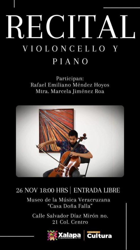 El martes 26 de noviembre a las 18:00 horas, en el Museo de la Música Veracruzana, se presentará un “Recital de violoncello y piano”; en el Teatro J.J. Herrera se proyectará la película “La mujer de estrellas y montañas”, de Santiago Esteinou, como parte de la Muestra Itinerante de Cine por la Identidad.