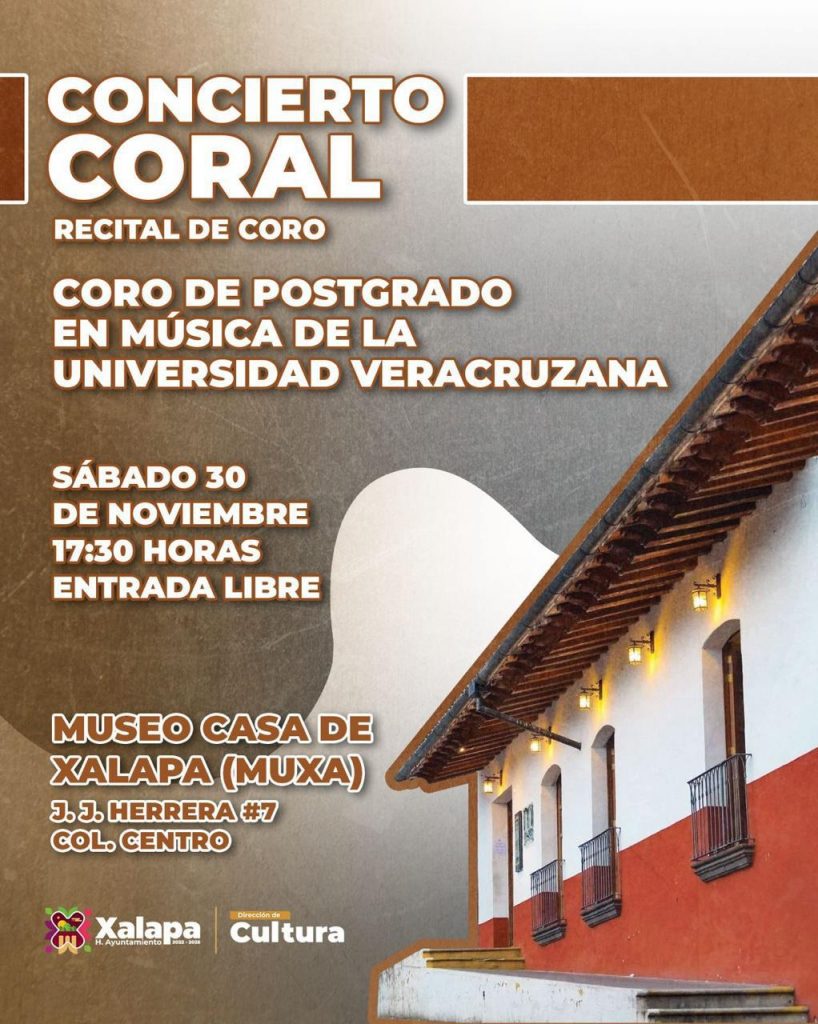 El sábado 30 de noviembre a las 17:30 horas, en este último recinto, el Coro de Posgrado en Música de la UV realizará un “Concierto coral”; a las 18:00 horas en el Museo de la Música Veracruzana, habrá un Ciclo de Piano con Alejandro Corona Aguilar; a las 19:00 horas en Palacio Municipal, la edición de “ApantallArte Itinerante” estará dedicada a “Así era Pancho Villa” (1957), de Ismael Rodríguez.