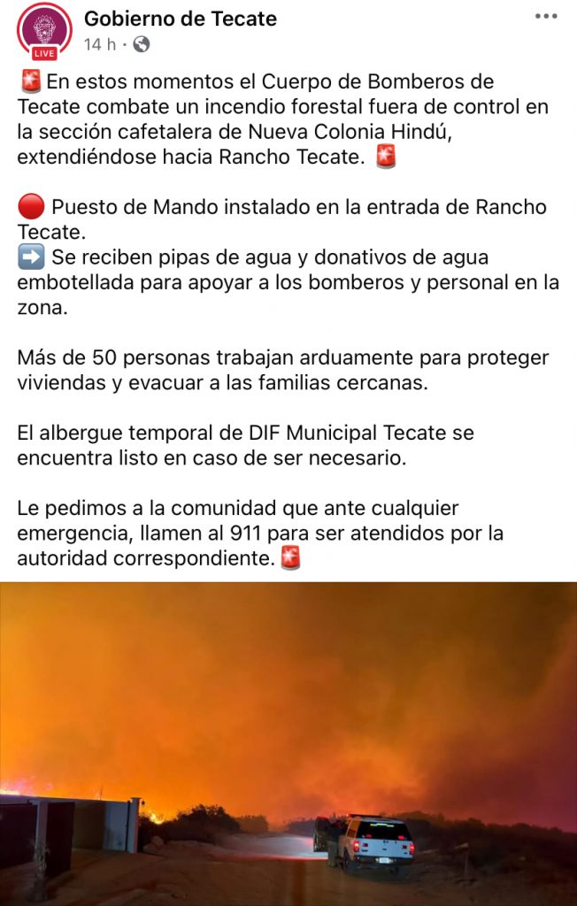El gobierno de Tecate a solicitado el apoyo de la ciudadanía para la obtención de pipas de agua que ayuden a proveer para contener el intenso fuego previo a la llegada de estructura habitacional.