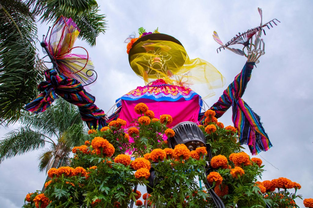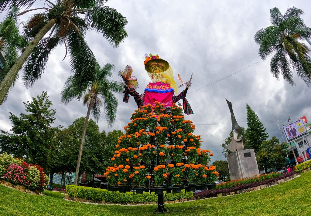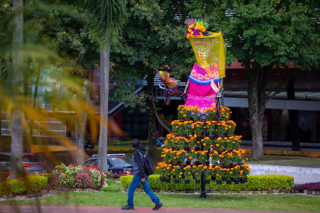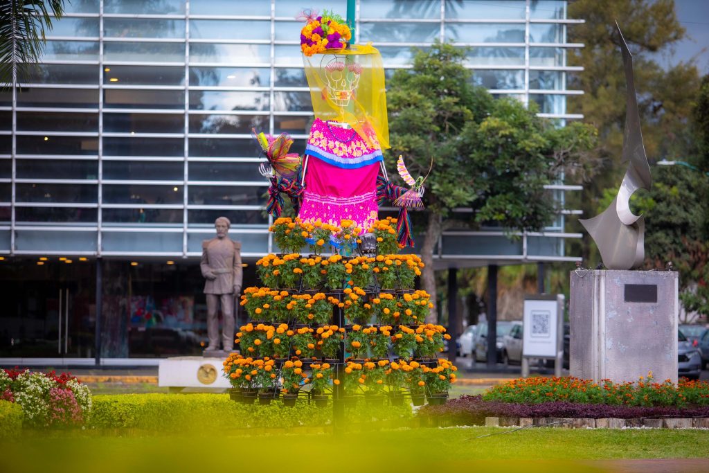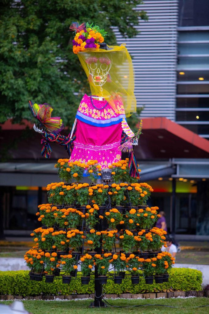 Xalapa, Ver.- Personal de la Dirección de Medio Ambiente instaló una catrina en la avenida Manuel Ávila Camacho, elaborada con flores de cempasúchil cultivadas en los viveros municipales.
