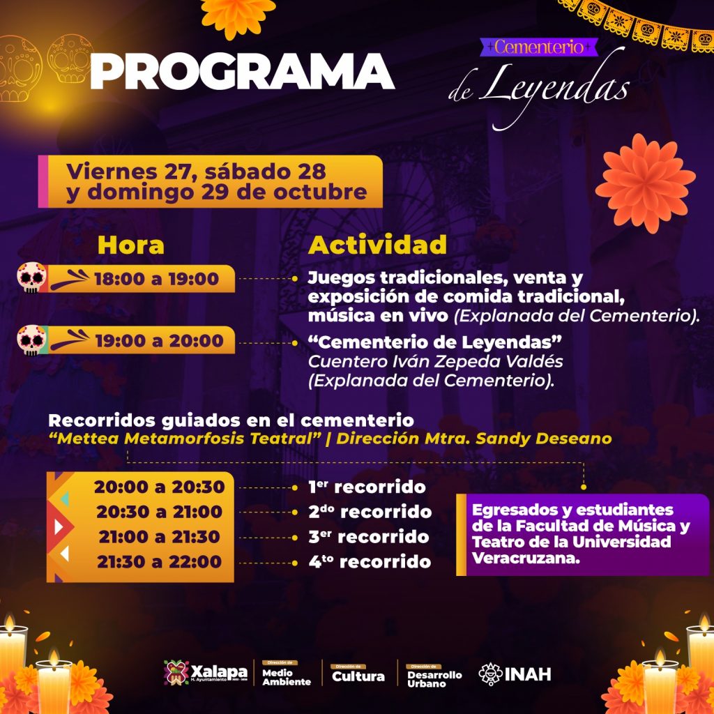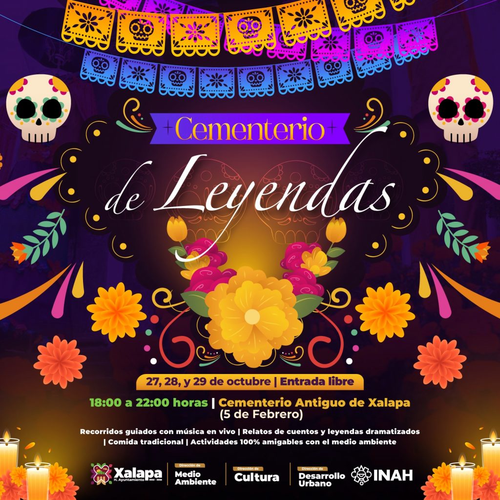 Xalapa, Ver.- En el marco de los festejos por el Día de Muertos, el Ayuntamiento, a través de la Dirección de Medio Ambiente y en coordinación con el Instituto Nacional de Antropología e Historia (INAH), invitan a la ciudadanía a disfrutar de un “Cementerio de Leyendas”, este 27, 28 y 29 de octubre en el Antiguo Cementerio Municipal, “5 de Febrero”, que abrirá sus puertas para disfrute de la población.