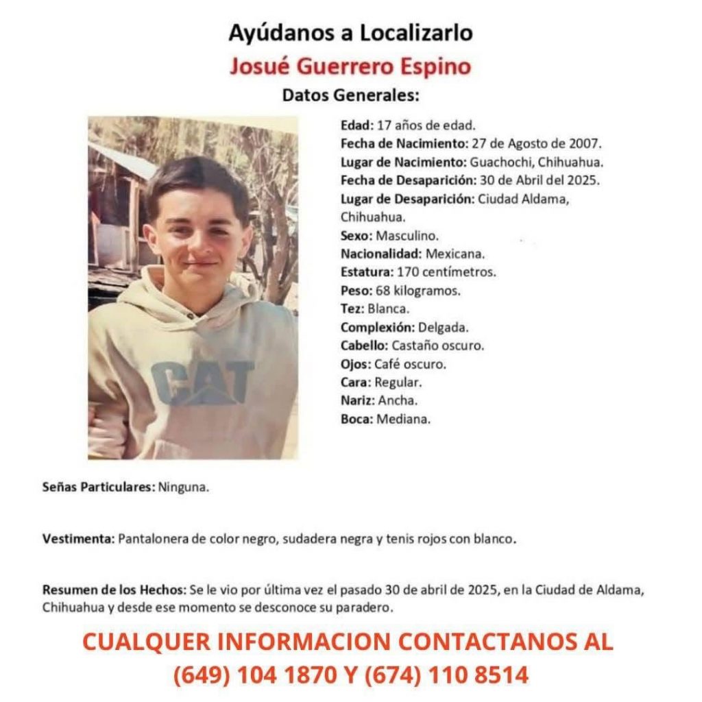 Josué Guerrero Espino, joven de 17 años reportado como desaparecido desde el 30 de abril en Aldama, apareció en un narcovideo difundido en redes sociales, donde afirma que fue levantado por un grupo criminal.