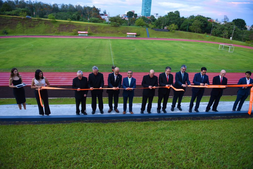 Xalapa, Ver.- Acompañado de autoridades de la Universidad Anáhuac Veracruz Campus Xalapa, el presidente municipal Ricardo Ahued Bardahuil realizó el corte del listón inaugural de la pista profesional de atletismo de la institución, acto con el que este miércoles se celebró el 30 Aniversario de este centro educativo.
