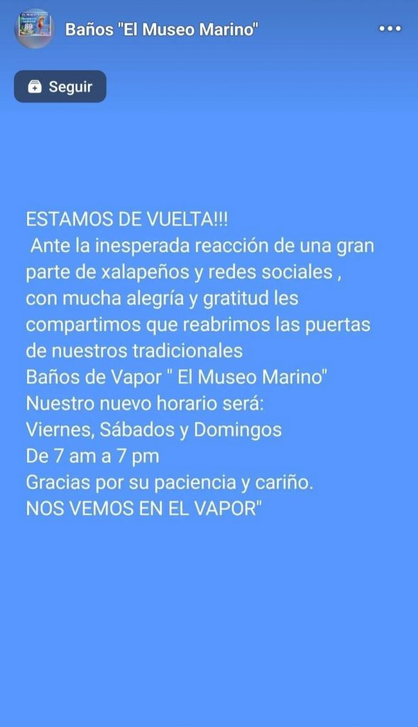 “Ante la inesperada reacción de una gran parte de xalapeños y redes sociales, con mucha alegría y gratitud les compartimos que reabrimos las puertas de nuestros tradicionales Baños de Vapor ‘El Museo Marino’.”