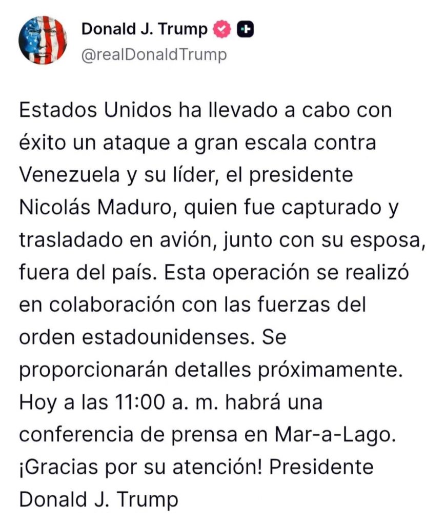 Trump confirmó que fuerzas estadounidenses lograron capturar a Nicolás Maduro y a su esposa, Cilia Flores, y que ambos fueron trasladados fuera de Venezuela, aunque no precisó el lugar exacto donde se encuentran. El presidente estadounidense indicó que la operación se realizó en conjunto con fuerzas del orden y que ofrecerá más detalles en una conferencia de prensa prevista para las próximas horas.