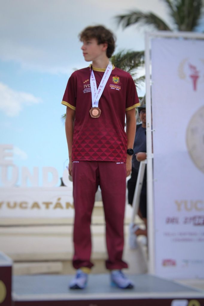 Progreso, Yuc., lunes 16 de junio de 2025.- Camilo GazolTorres se colgó la medalla de bronce en la categoría Juvenil Menor (16-17 años) en la prueba de acuatlón, poniendo en alto el nombre de Veracruz en la Olimpiada Nacional CONADE 2025.