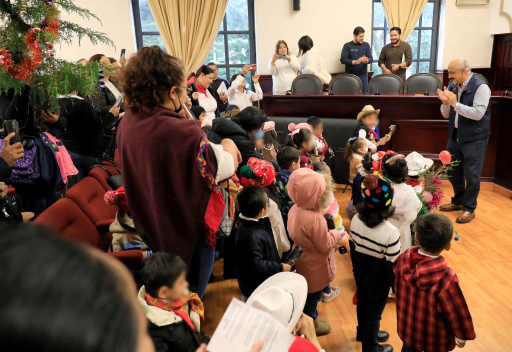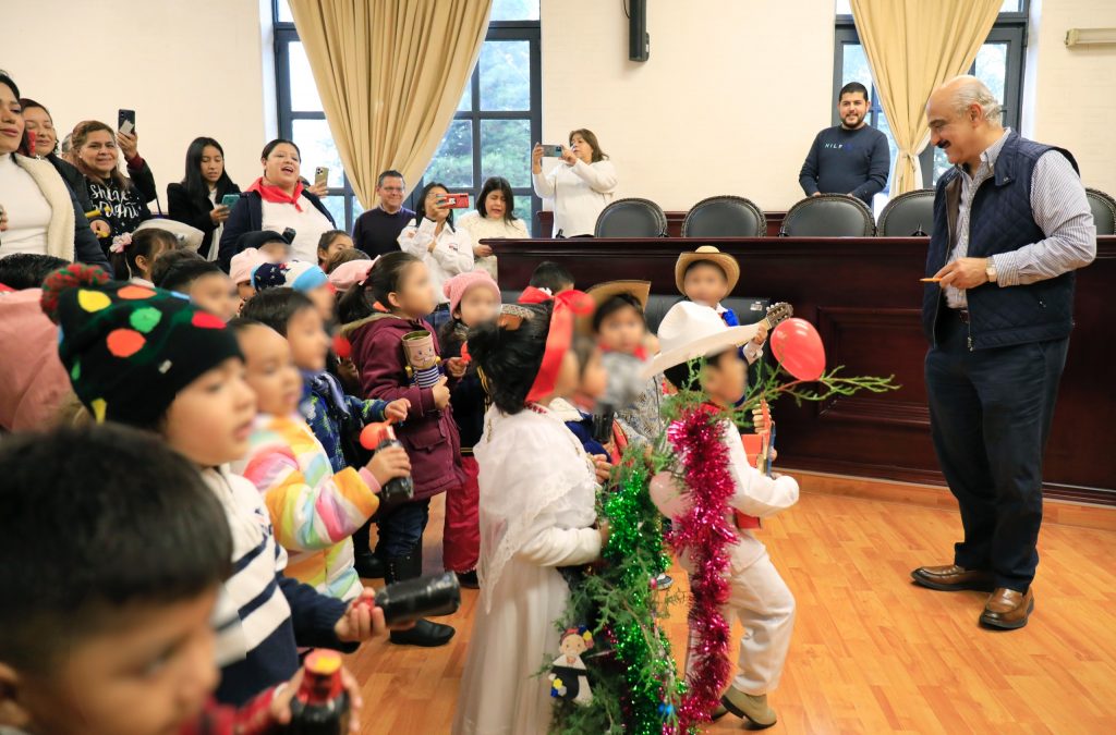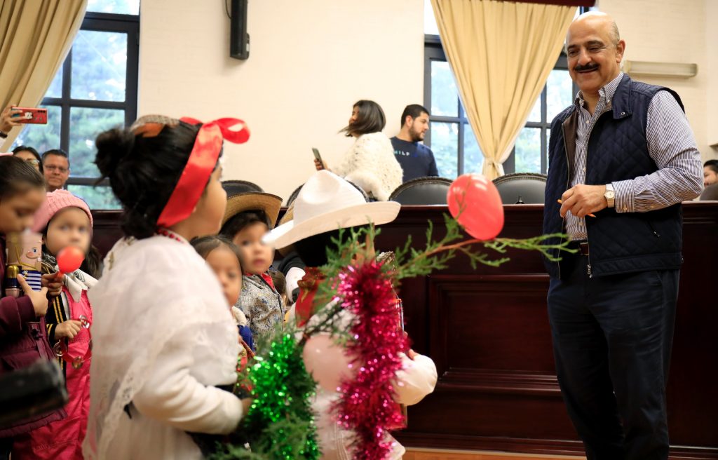 Xalapa, Ver.- El presidente municipal Ricardo Ahued Bardahuil recibió en la Sala de Cabildo a personal docente y alumnado del Jardín de Niños “José María Morelos y Pavón”, quienes le cantaron La Rama navideña.