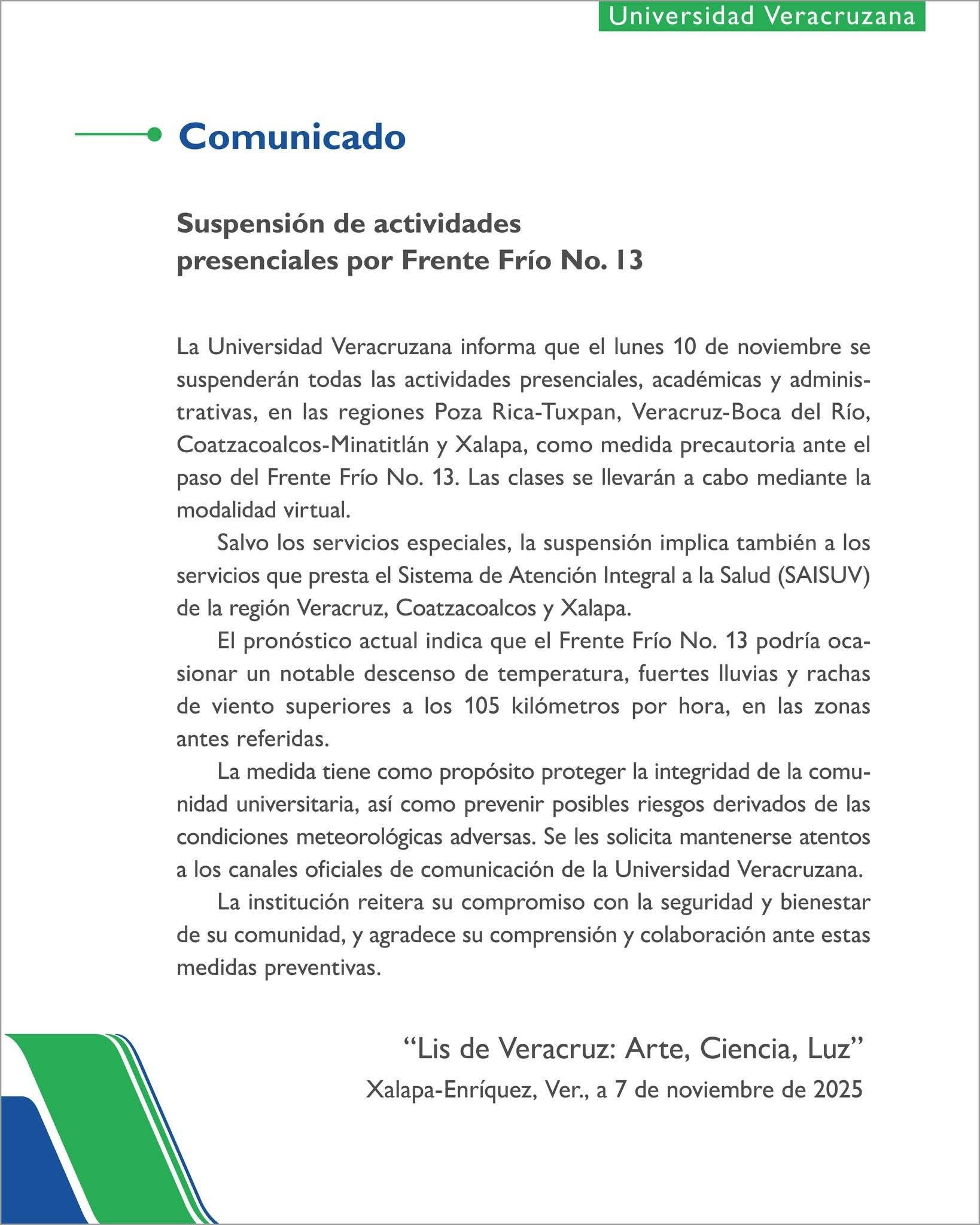 Suspende clases presenciales la Universidad Veracruzana en PozaRica, Tuxpan, #Veracruz, Coatzacoalcos, Minatitlán y Xalapa “Como medida precautoria ante el paso del Frente Frío No. 13, la Universidad Veracruzana informa que el lunes 10 de noviembre se ...