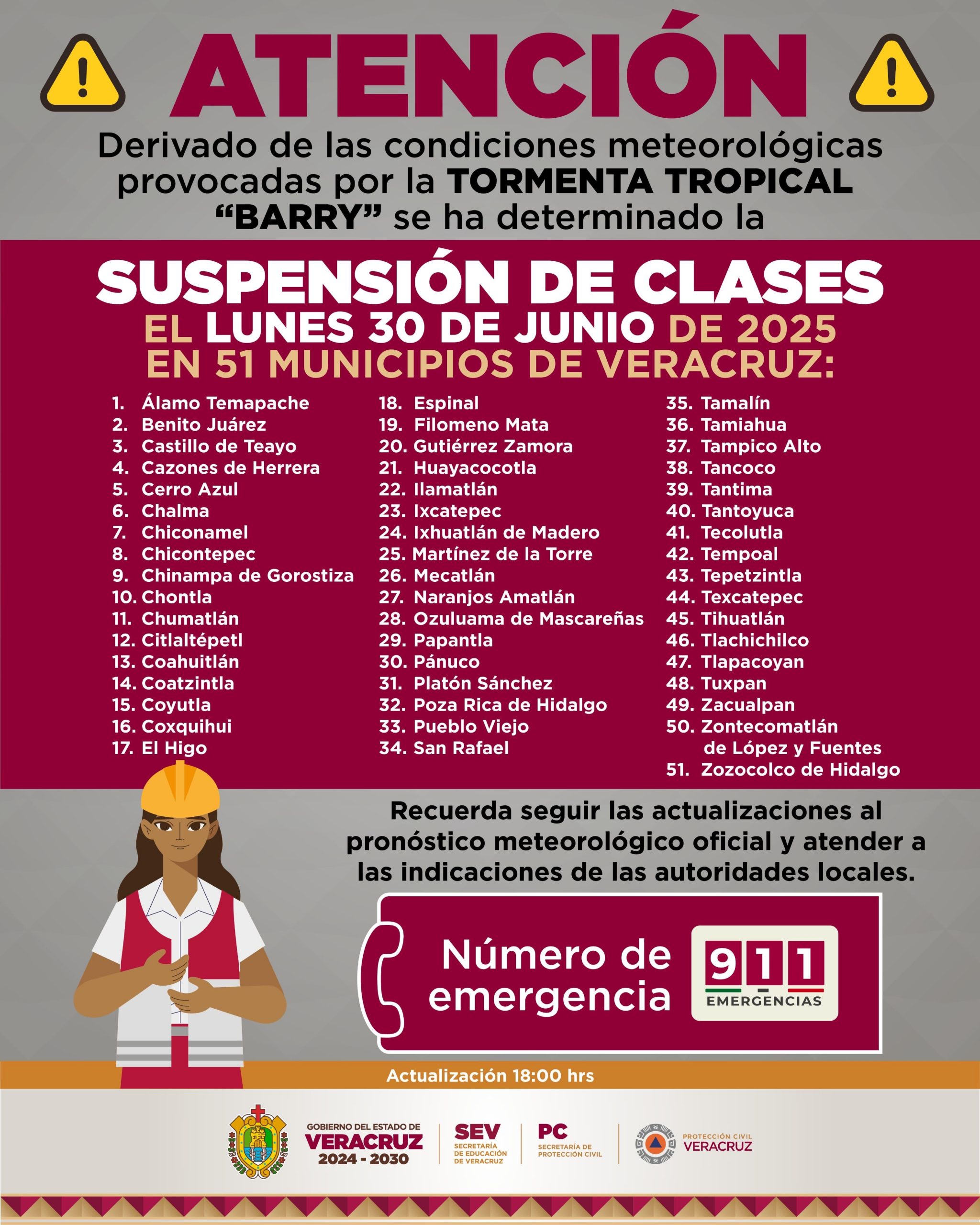 Xalapa, Ver., domingo 29 de junio de 2025. – Debido a los efectos de la Tormenta Tropical Barry, el Gobierno del Estado, a través de las secretarías de Educación y de Protección Civil, determinó suspender las clases yactividades escolares de ...