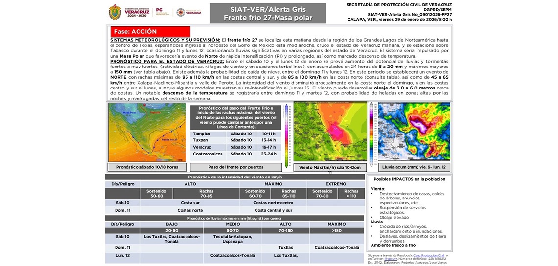 Xalapa, Ver., 9 de enero de 2026.- Ante los efectos que generaría el ingreso del Frente Frío 27 a partir de la tarde del sábado, el Sistema ...