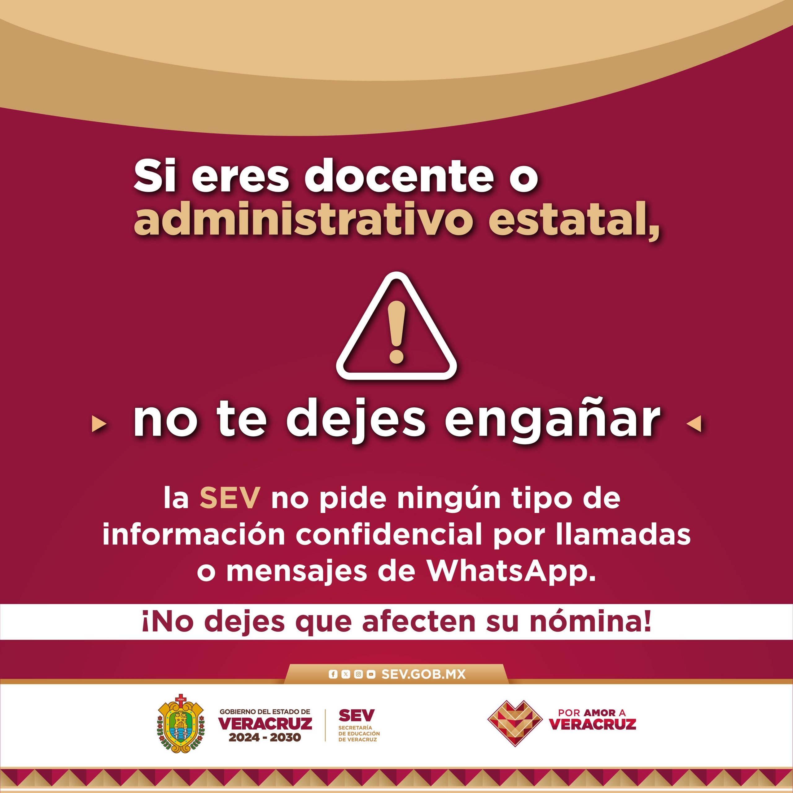 >Pide no proporcionar ningún tipo de información que les afecte en su nómina. Xalapa. Ver., sábado 23 de agosto de 2025.- Derivado de varios reportes, la Secretaría de Educación del Estado de Veracruz (SEV), a través de la Oficialía Mayor, ...