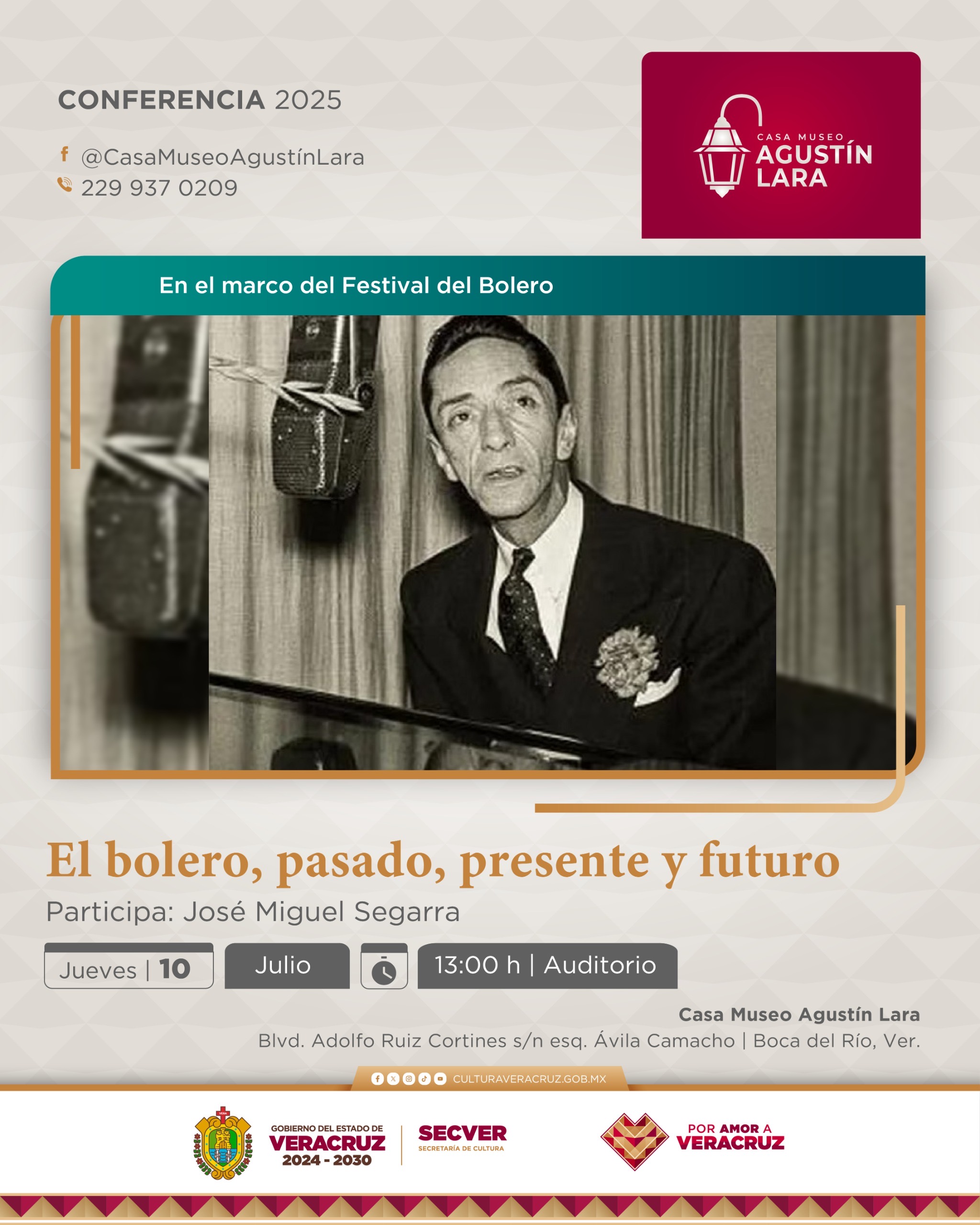 Xalapa, Ver., martes 08 de julio de 2025.- La Secretaría de Cultura de Veracruz (SECVER) invita a la conferencia magistral El Bolero, paso, presente y futuro, que se realizará el próximo jueves a las 13:00 horas, en el auditorio de la ...