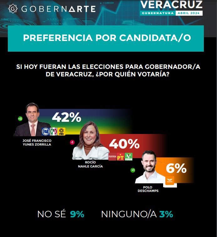 La casa encuestadora Gobernarte, publicó este lunes su medición a siete días del arranque de campaña en Veracruz.De acuerdo al documento, al 8 de abril del 2024 el candidato José Francisco Yunes Zorrilla, de la coalición “Fuerza y Corazón por Veracruz”, aventaja ...