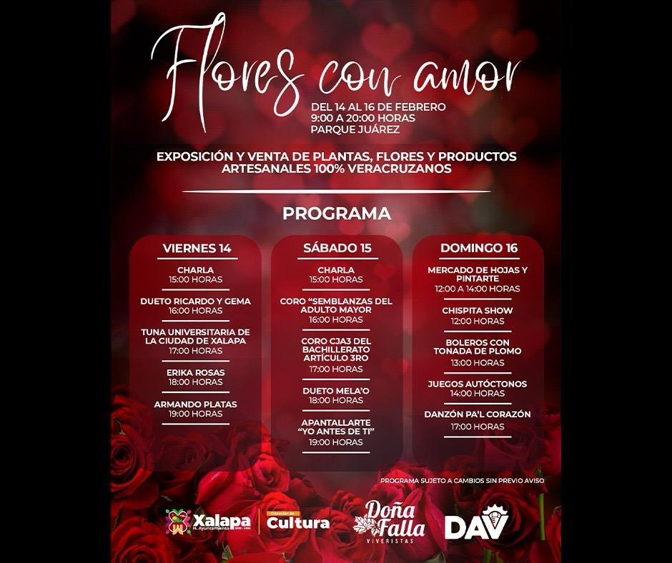 Xalapa, Ver.- Desde boleros y danza, hasta teatro y exposiciones artesanales podrá disfrutar la ciudadanía en la expo “Flores con Amor”, que se llevará a cabo del 14 al 16 de febrero en el parque Benito Juárez, de 9:00 a 21:00 horas. Este evento organizado por el ...