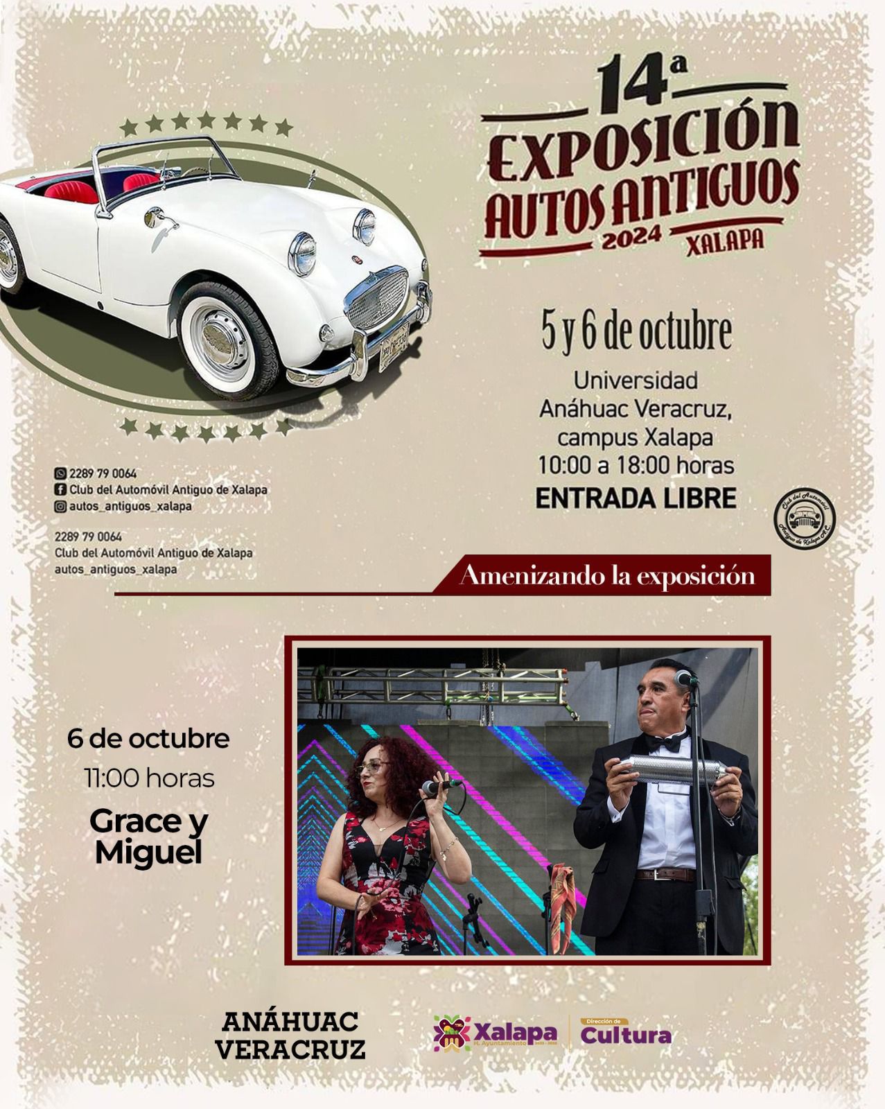 Xalapa, Ver.- Como parte de las actividades artísticas programadas por el Ayuntamiento a través de la Dirección de Cultura para la 14ª Exposición de Autos Antiguos de Xalapa, este domingo a las 11:00 horas, el dueto de “Grace y Miguel”, se presentará en el Campus ...