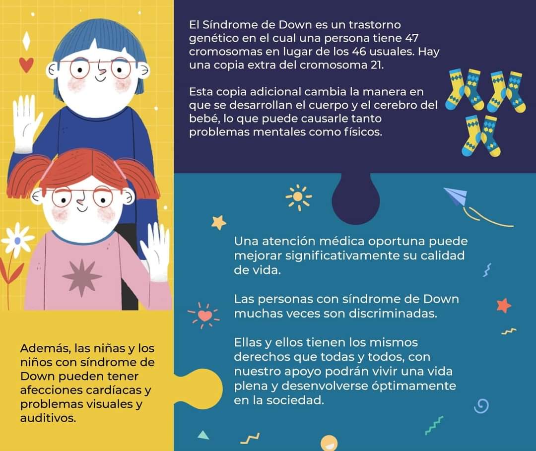 El Síndrome de Down no es una enfermedad, es resultado de una alteración genética y dura toda la vida. Todas y todos tenemos derecho a vivir una vida plena con inclusión educativa, laboral y social. La Asamblea General de la ONU decretó en el 2011 que el 21 de ...