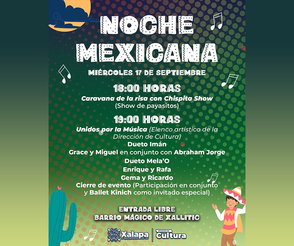 El miércoles, a las 18:00 horas, el Barrio Mágico de Xallitic será sede de una Noche Mexicana, con la Caravana de Risa de Chispita Show, además del elenco artístico de la Dirección de Cultura: Dueto Imán, Grace y Miguel con Abraham Jorge; Dueto Mela´O, Enrique y Rafa, Gema y Ricardo, y el Ballet Kinich.