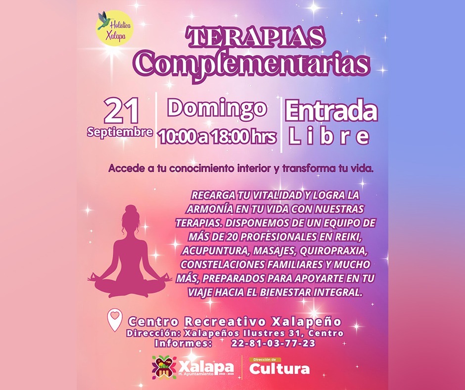 El domingo, a las 10:00 horas, en el CRX, se desarrollará la jornada de Terapias Complementarias, organizada por Holística Xalapa.