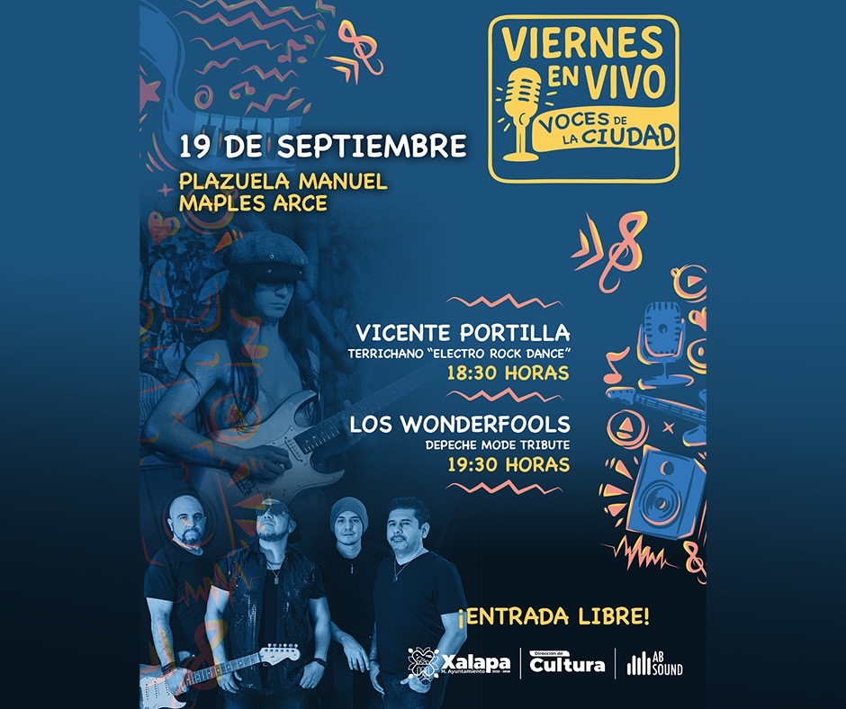 Media hora más tarde, la Plazuela Manuel Maples Arce tendrá el programa “Viernes en Vivo, Voces de la Ciudad”, con la música de Vicente Portilla y Wonderfools.