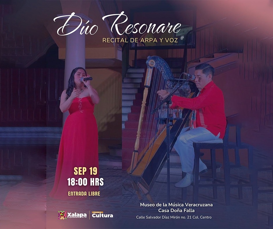 A las 18:00 horas, el Museo de la Música Veracruzana presentará al Dúo Resonare, en un recital de arpa y voz, mientras que en el CRX se escenificará “Luces y Plumas: Memorias de Revista”, del Estudio Arcadia.
