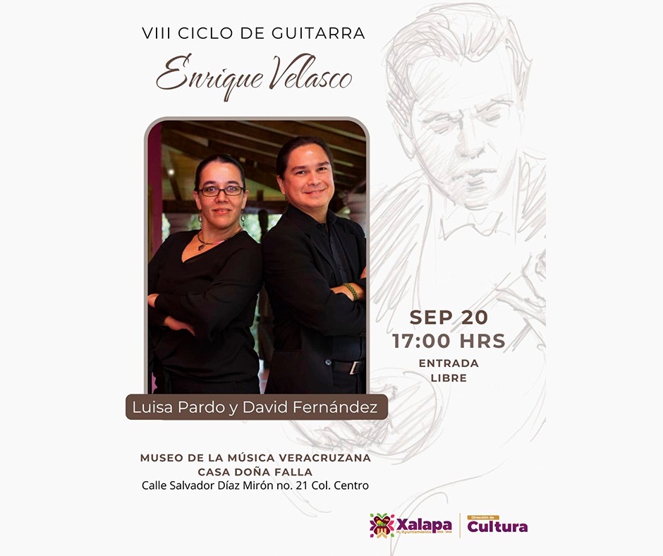 A las 17:00 horas, en el Museo de la Música Veracruzana continuará el VIII Ciclo de Guitarra “Enrique Velasco”, con la participación de Luisa Pardo y David Fernández.