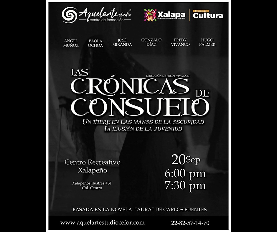 A las 18:00 horas, el CRX recibirá la obra “Las Crónicas de Consuelo”, de Aquelarte Estudio; mientras que en el Parque Juárez se presentará el programa “ApantallArte Itinerante”, con la proyección de “La leyenda del Chupacabras”.