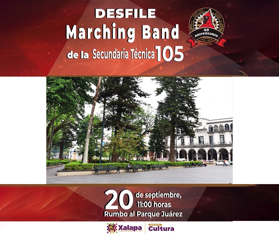 A las 11:00 horas, la Marching Band de la Secundaria Técnica 105 realizará un desfile en el Parque Juárez, y a las 13:00 horas, se celebrará en este mismo espacio el aniversario de la institución.