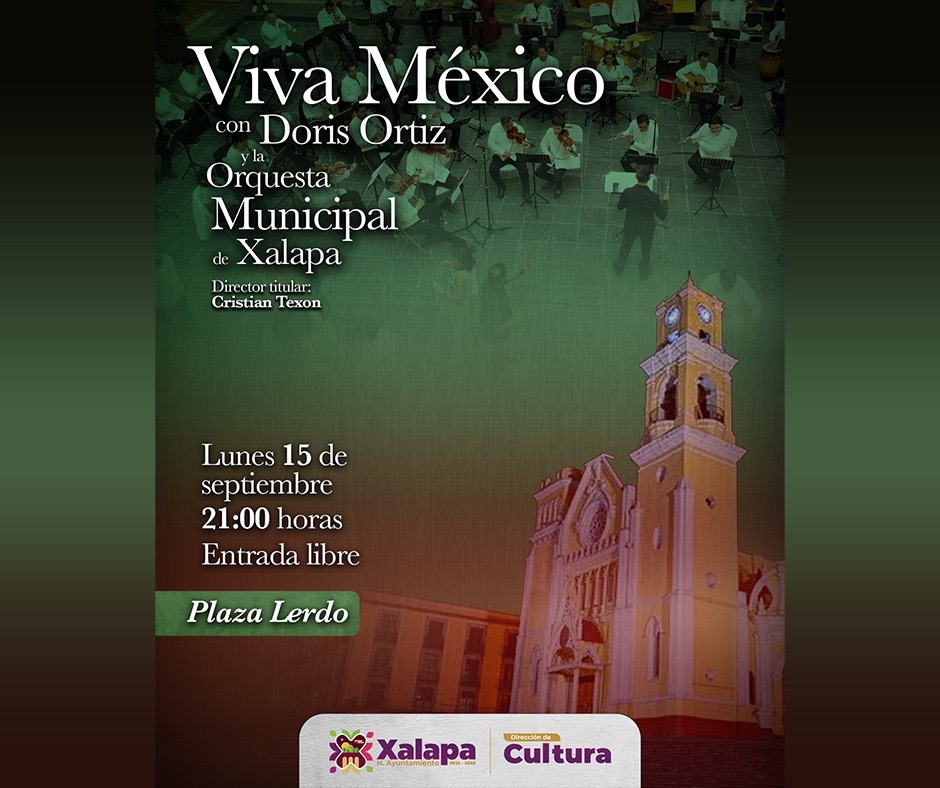 A las 21:00 horas, en la Plaza Lerdo se realizará el concierto ¡Viva México!, con la Orquesta Municipal de Xalapa y la cantante Doris Ortiz.