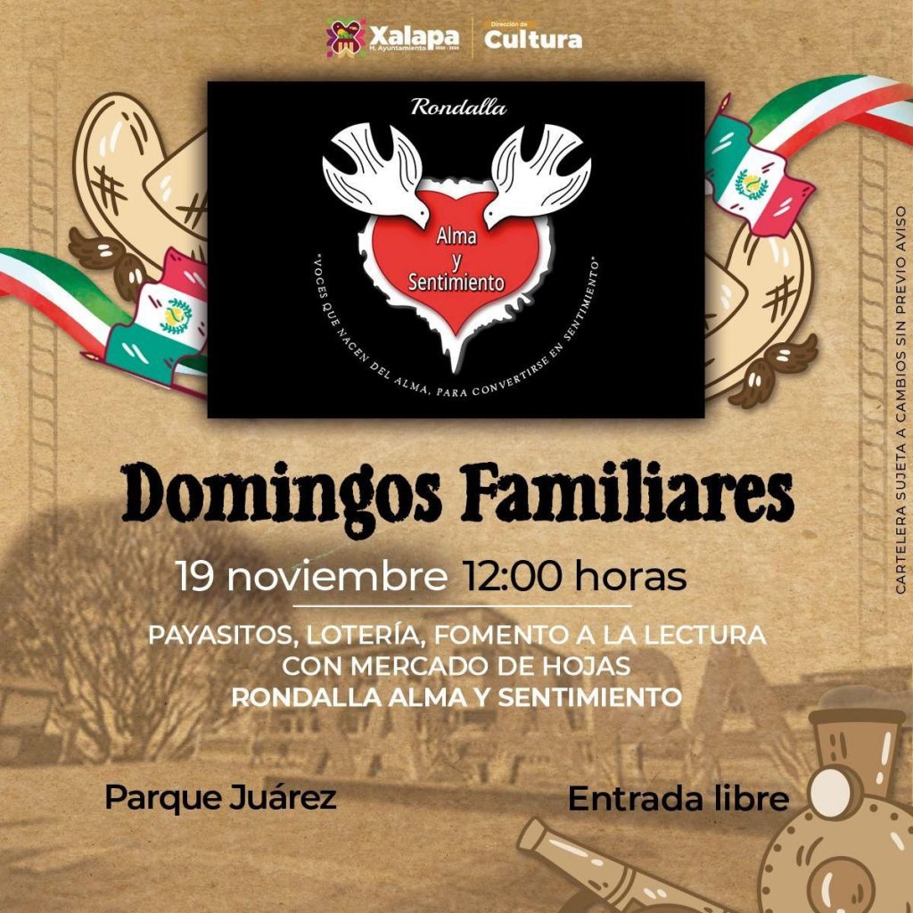 El 19 de noviembre y como parte de los Domingos Familiares, se presentará la Rondalla Alma y Sentimiento en el parque Benito Juárez, a las 12:00 horas, acompañada de payasitos, lotería mexicana y de fomento a la lectura con mercado de hojas; a las 17:00 horas en este mismo espacio, habrá “Danzón pal’ Corazón”.