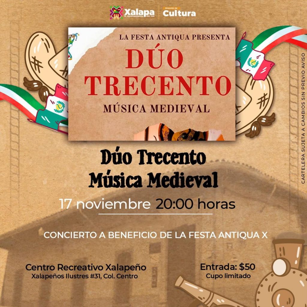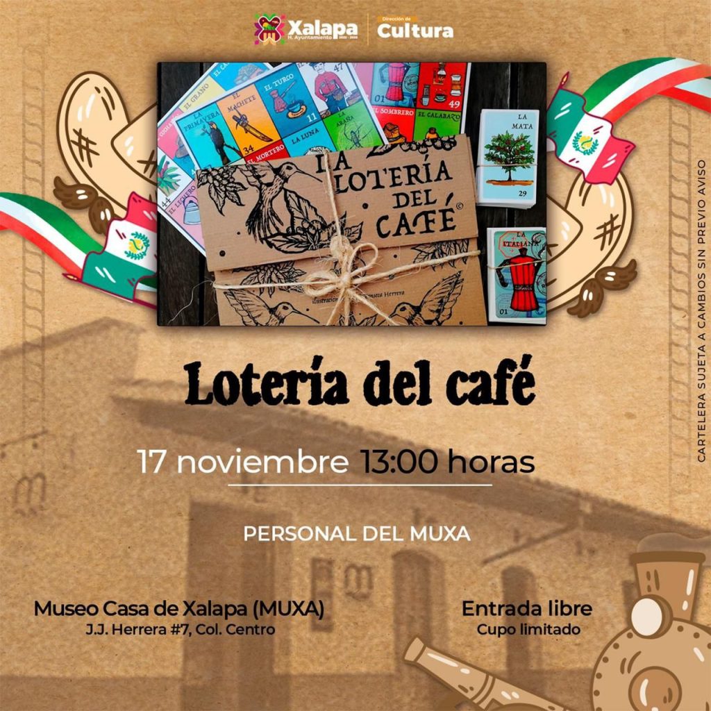 El viernes 17 de noviembre a las 13:00 horas, el personal del MUXA presentará la “Lotería del café”; a las 18:00 horas en el Museo de la Música Veracruzana, Jesús Aguilar Márquez llevará a cabo el recital de guitarra “Entre lo académico y lo hidalguense”; a las 19:00 horas en el Teatro J.J. Herrera, Alejandra Rueda festejará sus 25 años de trayectoria artística, y a las 20:00 horas en el CRX, el Dúo Trecento ofrecerá un concierto en beneficio de la Festa Antiqua X.