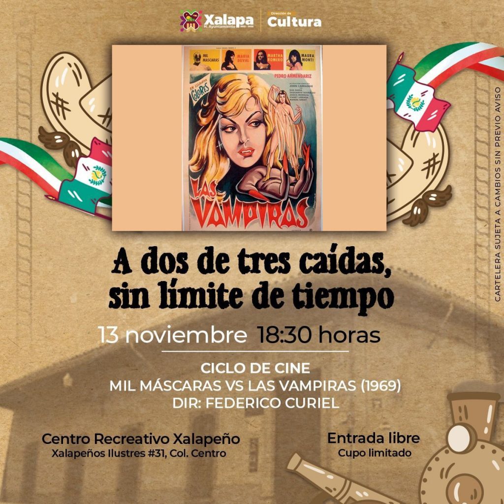 Además, este lunes 13 de noviembre a las 18:30 horas en el Centro Recreativo Xalapeño (CRX), se proyectará la película “Mil Máscaras vs Las Vampiras”, del director Federico Curiel, como parte del Ciclo de Cine “A dos de tres caídas, sin límite de tiempo”, y a las 19:00 horas, en el Teatro J.J. Herrera, Las Sangres Compañía presentará la obra “Rojo”.