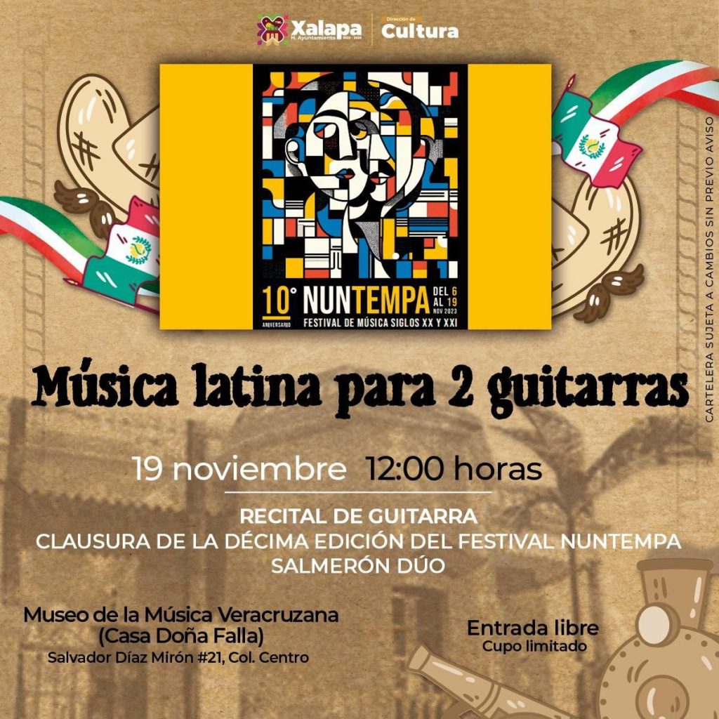 A las 12:00 horas en el Museo de la Música Veracruzana, será la clausura de la Décima Edición del Festival Nuntempa, con el concierto “Música Latina para dos guitarras”; y a las 17:00 horas, Misael Jiménez e invitados ofrecerán un recital de trompeta. En el Auditorio de la IMAC, el Ballet Folklórico Tenek presentará “Tradiciones de mi pueblo”.