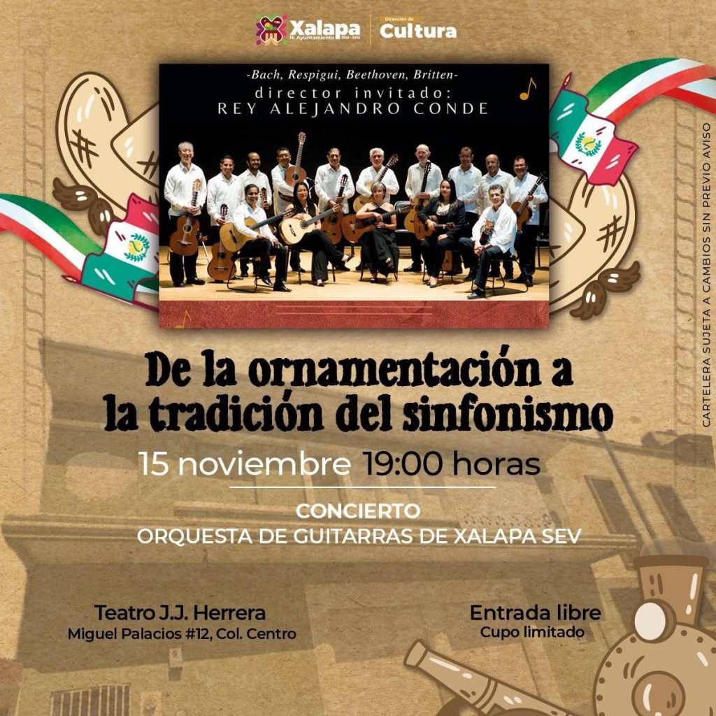 También este día y a la misma hora, en el Museo de la Música Veracruzana, arranca el ciclo de charlas “Acercamiento a la musicología mexicana”, con “Identidad Nacional a través de las artes”, a cargo de Enrique Salmerón; a las 19:00 horas en el Teatro J.J. Herrera, la Orquesta de Guitarras de Xalapa ofrecerá el concierto “De la ornamentación a la tradición del sinfonismo”.