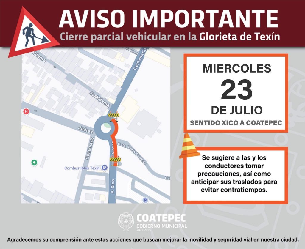El H. Ayuntamiento de Coatepec informó a la ciudadanía que, con motivo de trabajos de mantenimiento y rehabilitación vial, a partir del miércoles 23 de julio se realizará un cierre parcial a la circulación en la Glorieta de Texín, específicamente en el sentido Xico-Coatepec.