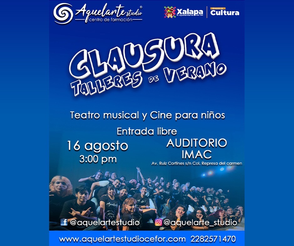 A las 15:00 horas, el auditorio de la IMAC recibirá la clausura de los talleres de verano de teatro musical y cine para niños de Aquelarte Studios. A las 15:30 horas, el Barrio Mágico de Xallitic celebrará su segundo aniversario con música, danza, leyendas, ópera, ballet y cine.