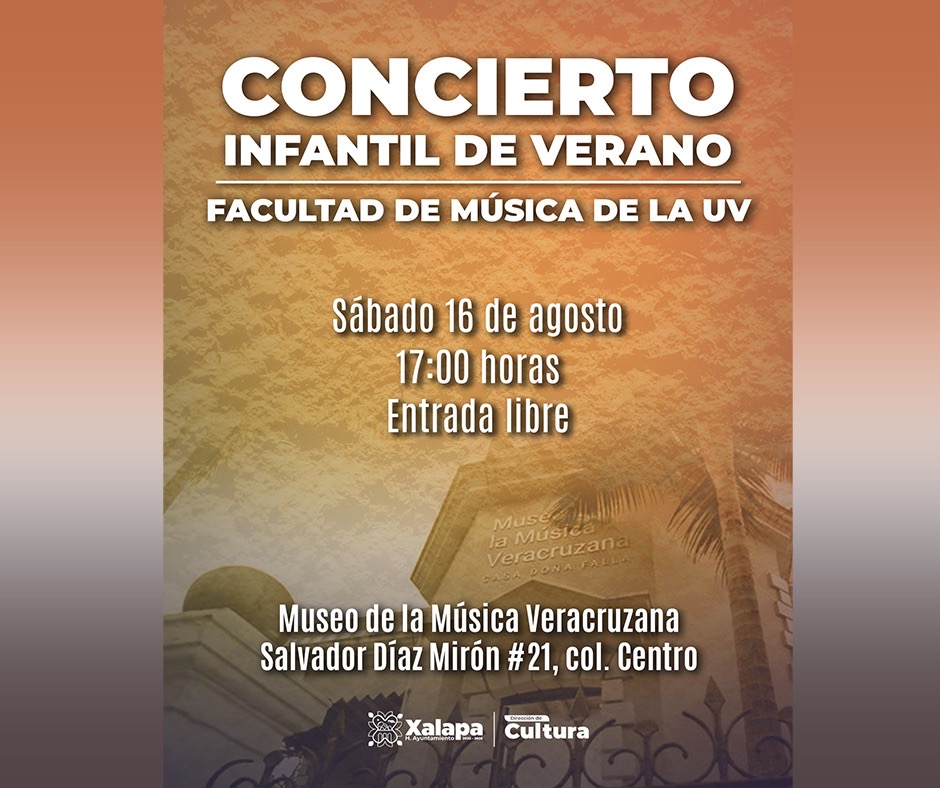 A las 17:00 horas, el Museo de la Música Veracruzana tendrá dos presentaciones: el Concierto Infantil de Verano de la Facultad de Música de la UV y el recital de canto “Cita con Ángeles”, de alumnos de la soprano Ana Yuri Serna.