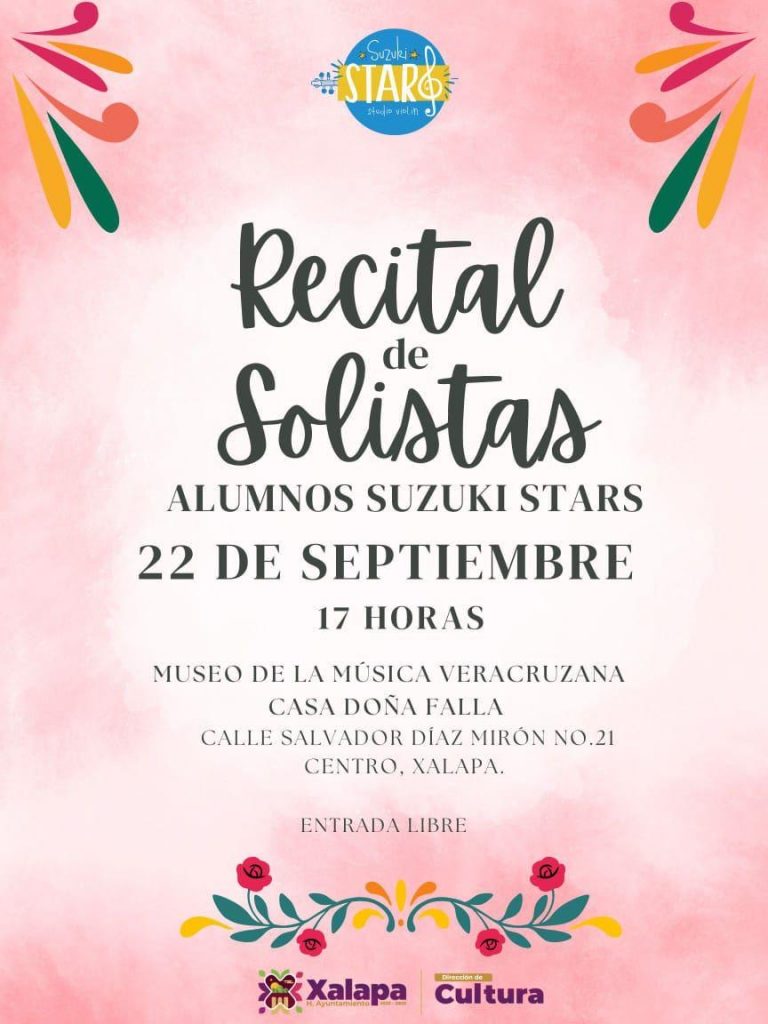 El sábado 21 y domingo 22 en el parque Benito Juárez se realizará el Festival artesanal “México lindo & Querido”. El 21, a las 19:30 horas en el auditorio de la IMAC, Fredy Vivanco presentará la obra “Las crónicas de Consuelo”; y el 22 a las 17:00 horas en el Museo de la Música Veracruzana, los alumnos de Suzuki Star ofrecerán un recital de solistas.