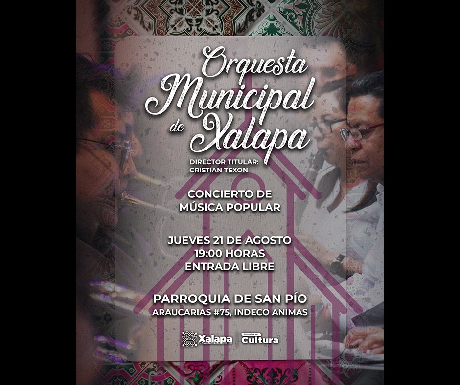 A las 19:00 horas, en la parroquia San Pío se presentará la Orquesta Municipal de Xalapa con un concierto de música popular; y en el CRX estará “Ambulantito”, con un programa de cortos.