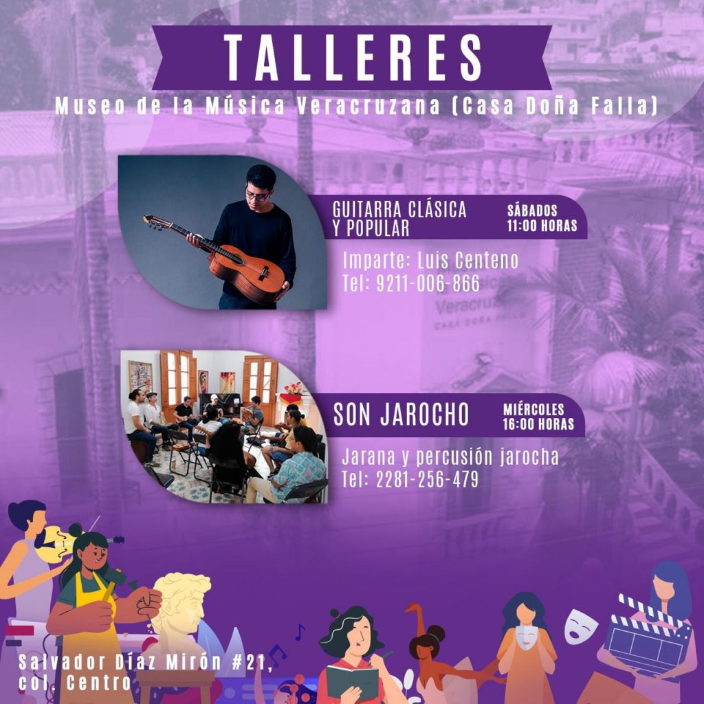 En la Casa Doña Falla Museo de la Música Veracruzana, los sábados a las 11:00 horas se imparte el Taller de Guitarra Clásica y Popular; y los miércoles a las 16:00 horas, de Son Jarochos.