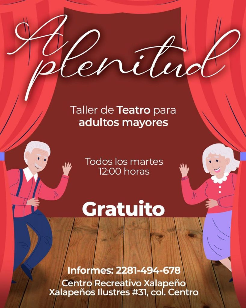 Todos los martes a las 12:00 horas en el Centro Recreativo Xalapeño, se sigue impartiendo el Taller de Teatro “A plenitud”, dirigido a personas adultas mayores.