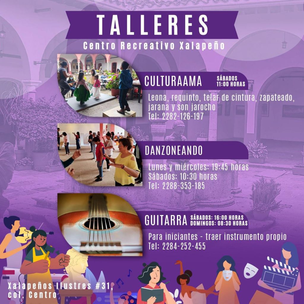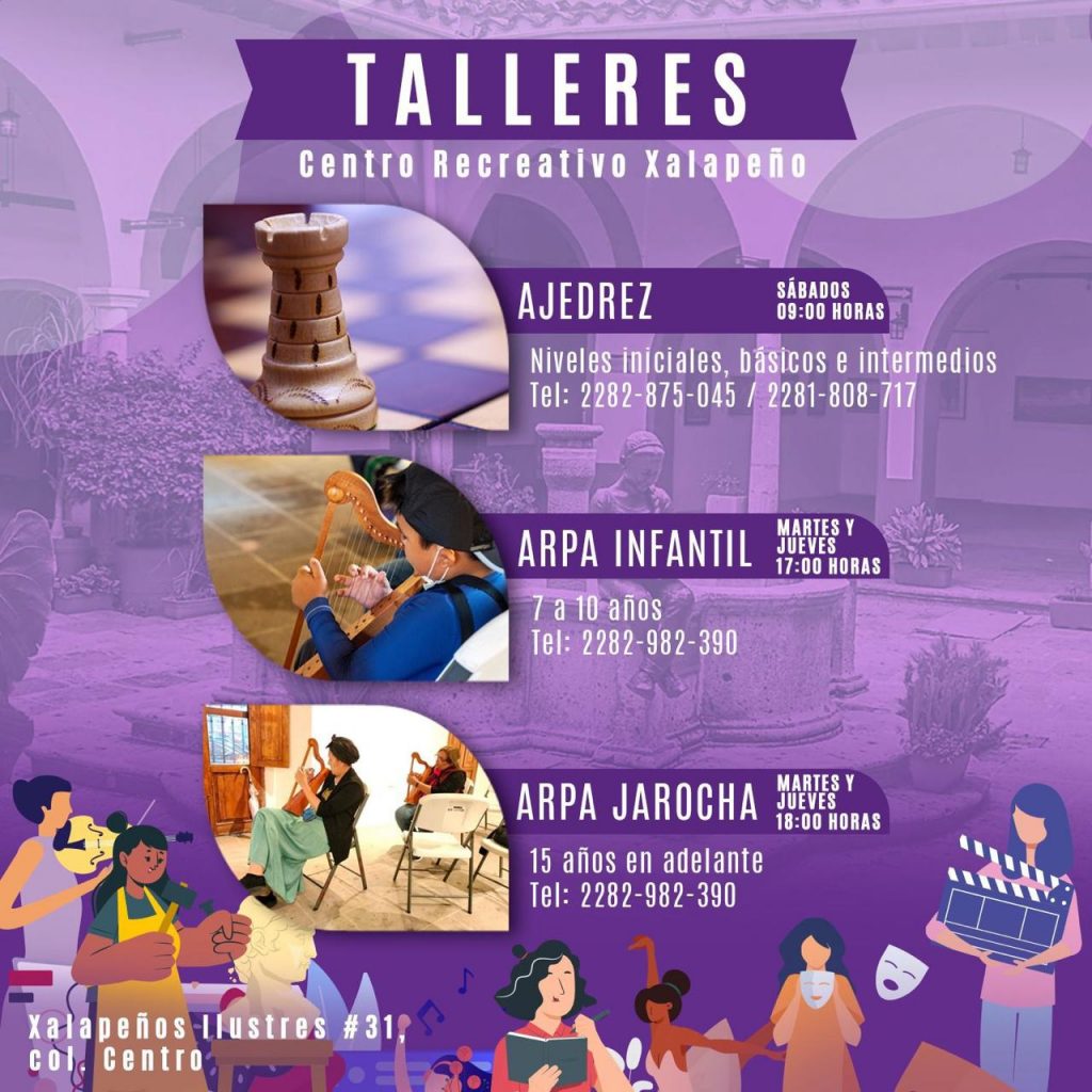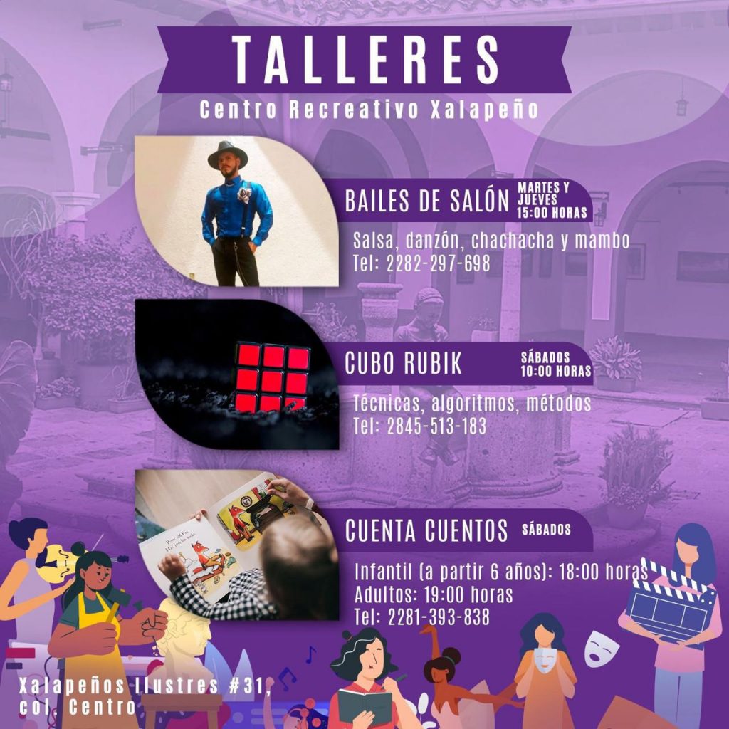 En cuanto a los talleres gratuitos, en el Centro Recreativo Xalapeño se siguen impartiendo los talleres de ajedrez todos los sábados a las 9:00 horas; de Bailes de Salón, Arpa Infantil y Arpa Jarocha, martes y jueves a las 15:00, 17:00 y 18:00 horas, respectivamente; Cubo Rubik, Culturama, y cuentacuentos, los sábados a las 10:00, 11:00 y 18:00 horas; danzoneando, los lunes, miércoles y sábado; y guitarra, los sábados y domingos.