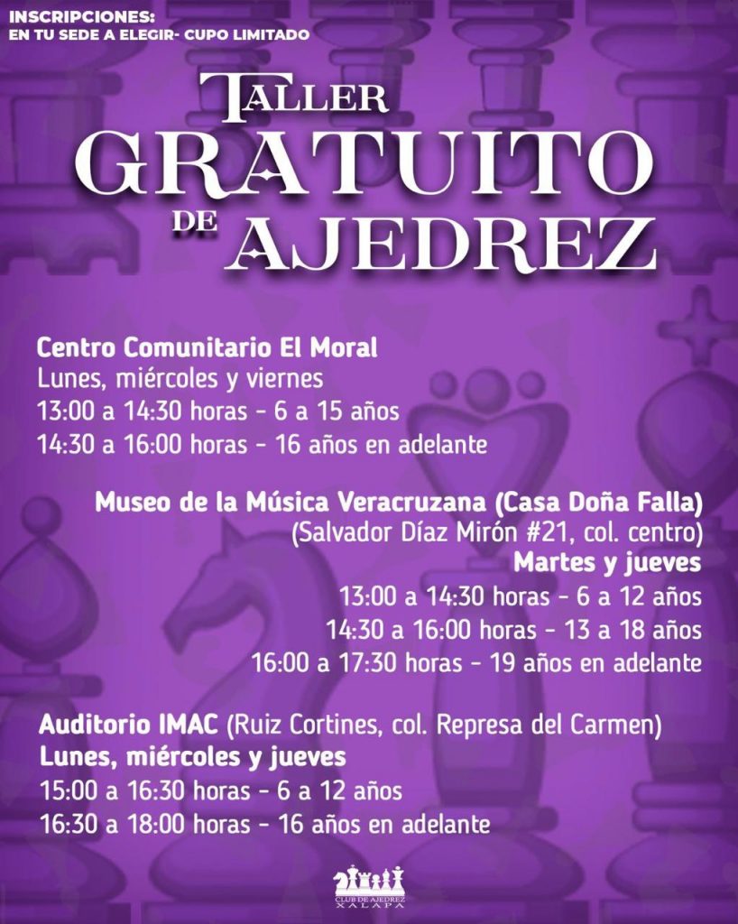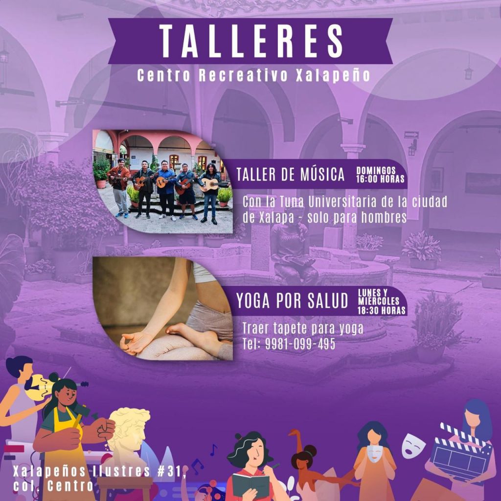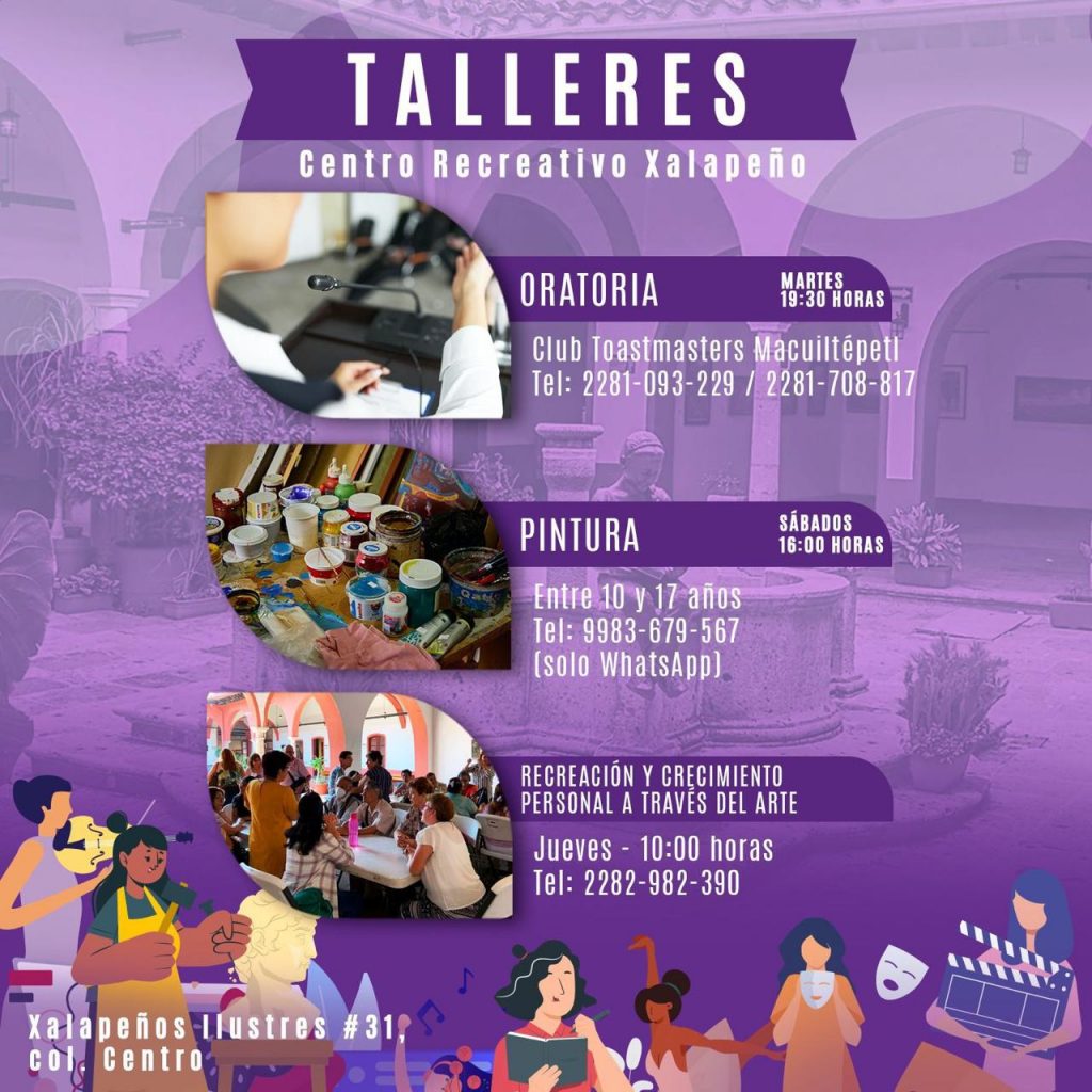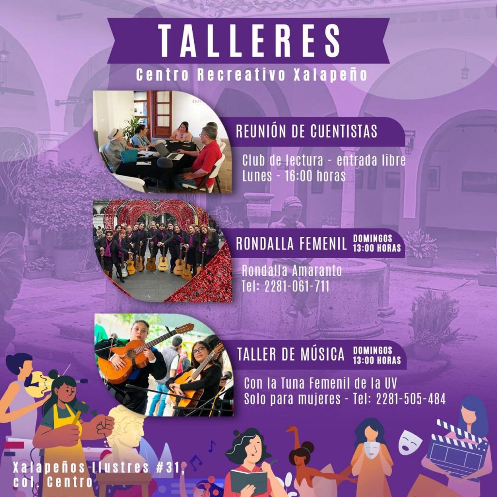 En cuanto a los talleres gratuitos, en el Centro Recreativo Xalapeño se siguen impartiendo los talleres de ajedrez todos los sábados a las 9:00 horas; de Bailes de Salón, Arpa Infantil y Arpa Jarocha, martes y jueves a las 15:00, 17:00 y 18:00 horas, respectivamente; Cubo Rubik, Culturama, y cuentacuentos, los sábados a las 10:00, 11:00 y 18:00 horas; danzoneando, los lunes, miércoles y sábado; y guitarra, los sábados y domingos.