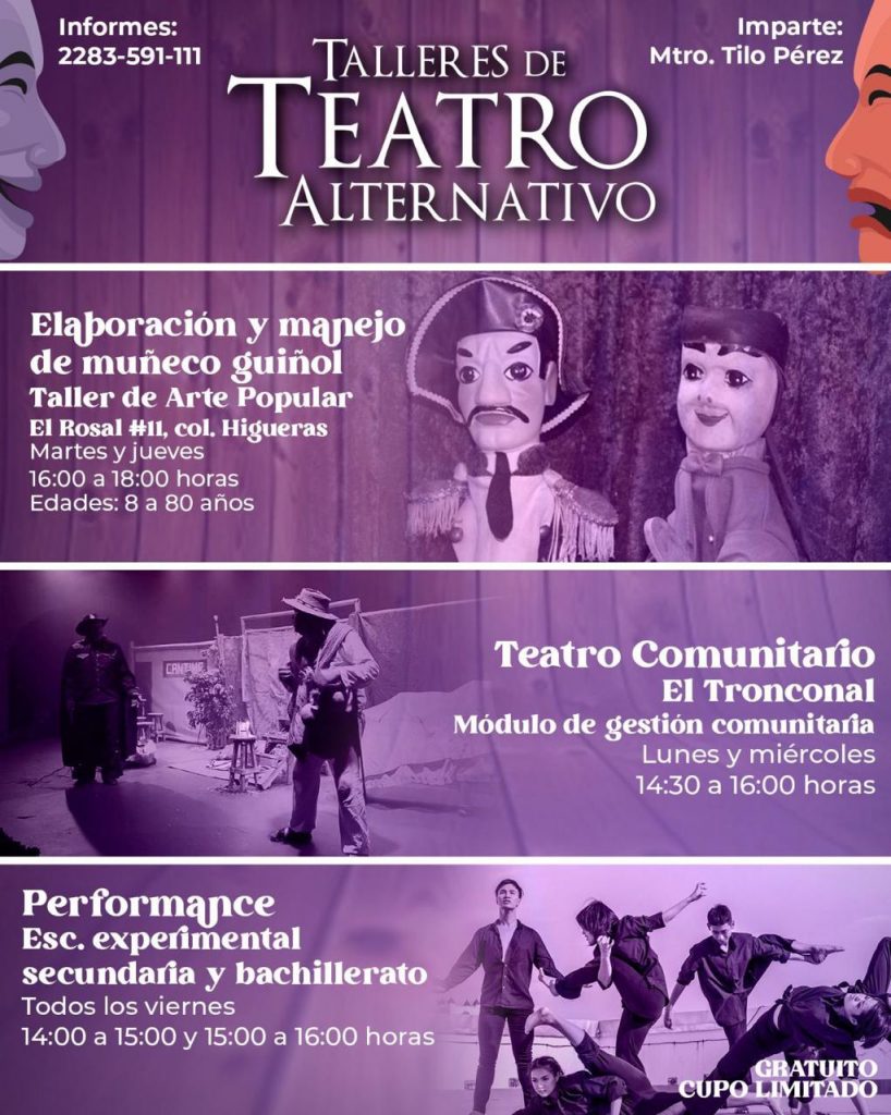 También, el maestro Tito Pérez imparte los Talleres de Teatro Alternativo en el TAP sobre “Elaboración y manejo de muñeco guiñol”, “Teatro Comunitario” en el Módulo de Gestión Comunitaria El Tronconal, y “Performance” en la Escuela Experimental Secundaria y Bachillerato.