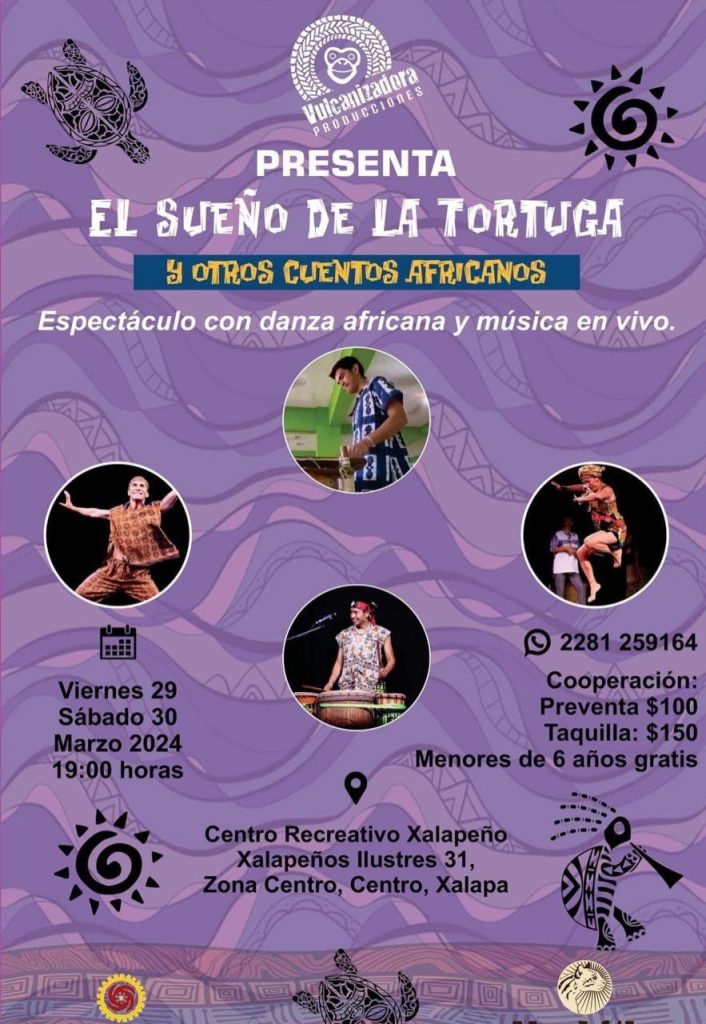 El viernes 29 y sábado 30 de marzo en el Centro Recreativo Xalapeño, Vulcanizadora Producciones desarrollará su espectáculo de danza africana y música en vivo “El sueño de la tortuga”.