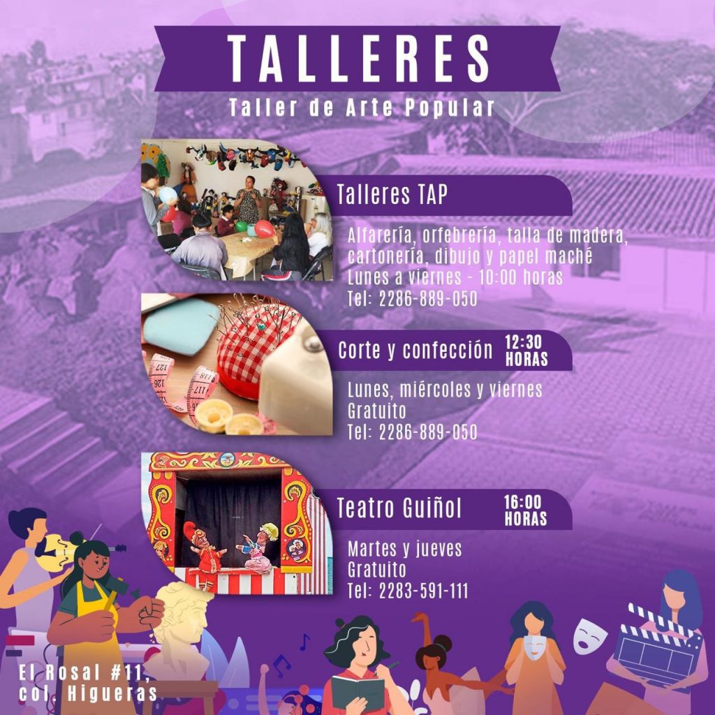 En el Taller de Arte Popular (TAP), de lunes a viernes a las 10:00 horas, de alfarería, orfebrería, talla de madera, cartonería, dibujo y papel maché; de corte y confección, los lunes, miércoles y viernes a las 12:30 horas y de Teatro Guiñol, los martes y jueves a las 16:00 horas.
