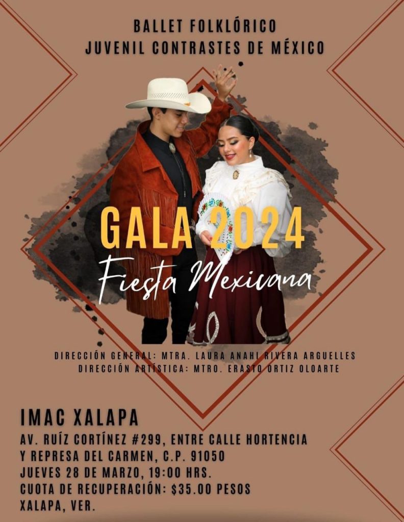 Posteriormente, el jueves 28 de marzo a las 19:00 horas en el Auditorio del IMAC, el Ballet Folklórico Juvenil Contrastes de México presentará su Gala 2024 “Fiesta Mexicana”.