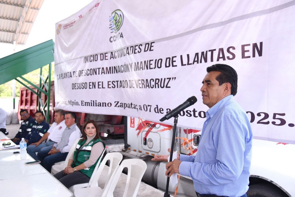 La Bocana, Mpio. de Emiliano Zapata, Ver., 07 de agosto de 2025.- El presidente de la Junta de Coordinación Política de la LXVII Legislatura, diputado Esteban Bautista Hernández, asistió al inicio de actividades de la Planta de Descontaminación y Manejo de Llantas en Desuso en el estado, ubicada en la comunidad La Bocana, municipio de Emiliano Zapata.
