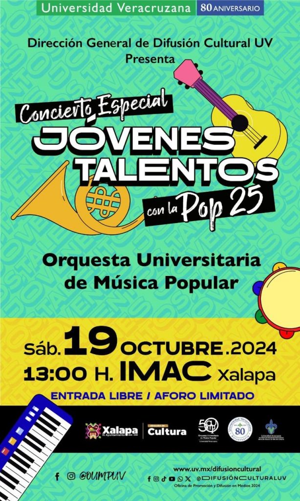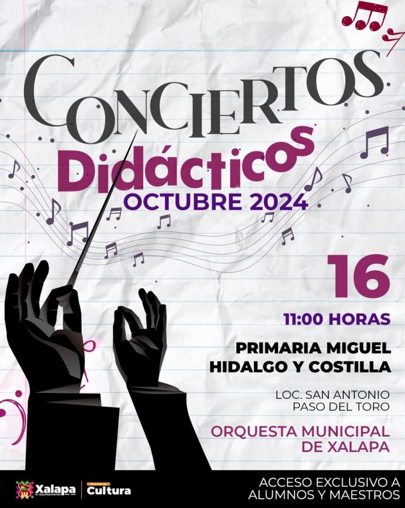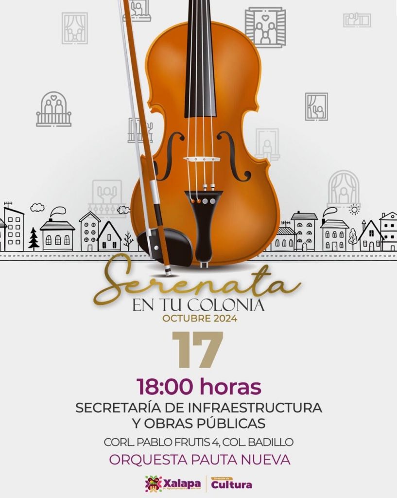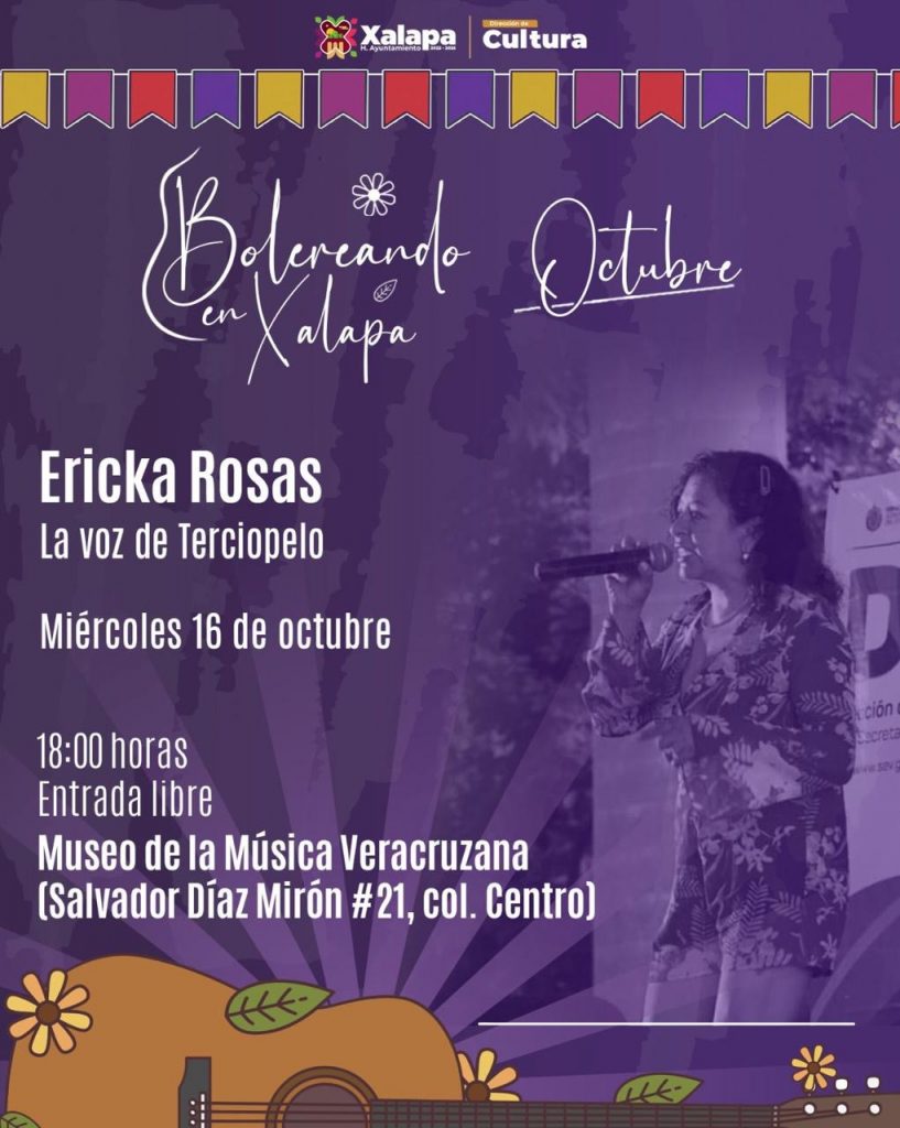 El miércoles 16 de octubre a las 11:00 horas, la Orquesta Municipal de Xalapa estará en la primaria “Miguel Hidalgo y Costilla”; a las 17:00 horas en el CRX, los alumnos de CODA ofrecerán un concierto, y a las 18:00 horas en el Museo de la Música Veracruzana, lo hará Ericka Rosas, “La voz de terciopelo”. Una hora más tarde, en el Teatro J.J. Herrera, la Orquesta Universitaria de Música Popular presentará “Rock & cuerdas recargado”.